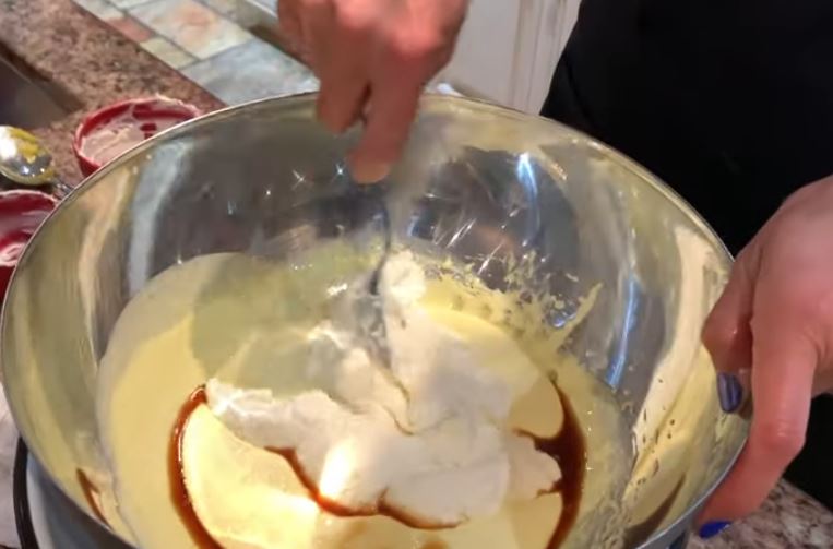 Προσθέστε 1 & 1/2 φλιτζάνι τυρί μασκαρπόνε στο μείγμα και ανακατέψτε απαλά με το κρόκο του αυγού και το μείγμα ζάχαρης. Προσθέστε 1 κουταλάκι του γλυκού εκχύλισμα βανίλιας