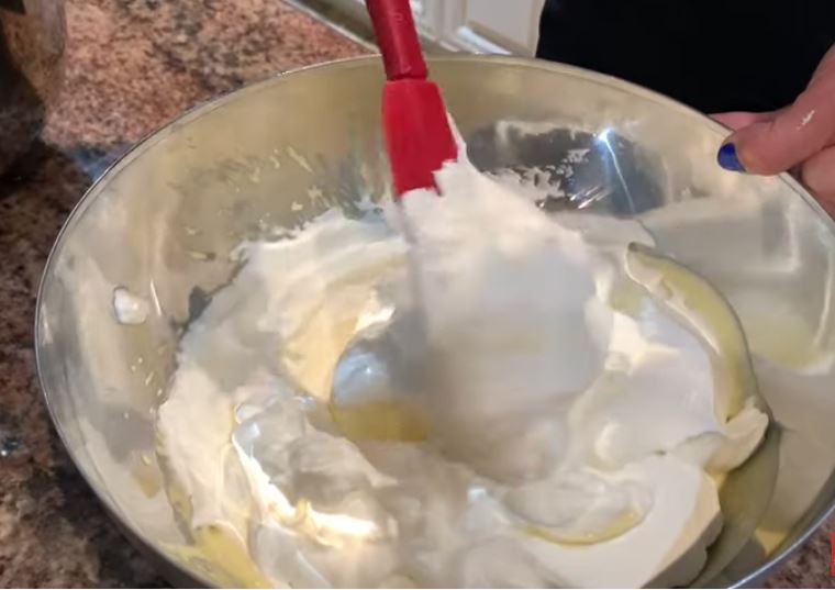 Προσθέστε τη κρέμα σαντιγί σιγά σιγά στο μείγμα και ανακατέψτε απαλά.