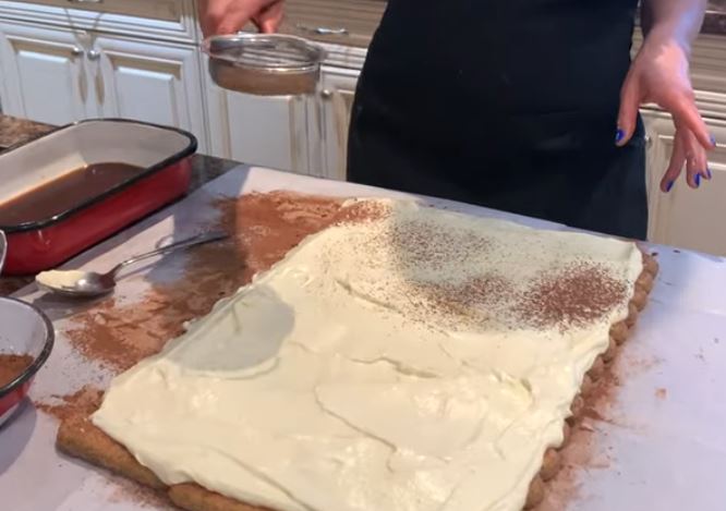 Ξετυλίξτε το χαρτί και χρησιμοποιήστε το υπόλοιπο μείγμα κρέμας για να το απλώσετε πάνω στο ρολό τιραμισού σας. Πασπαλίστε με κακάο και ζάχαρη άχνη.