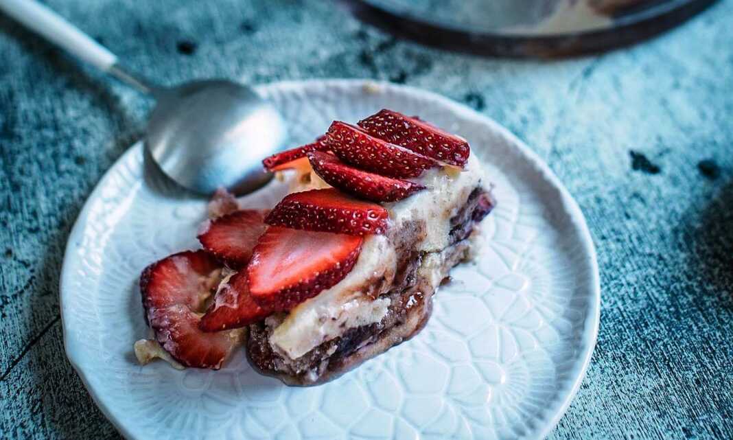 Το φρουτένιο τιραμισού περιλαμβάνει στρώσεις μπισκότων σαβουαγιαρ με σιρόπι φράουλας, σαντιγί μασκαρπόνε βανίλιας και φρέσκες φέτες φράουλας.