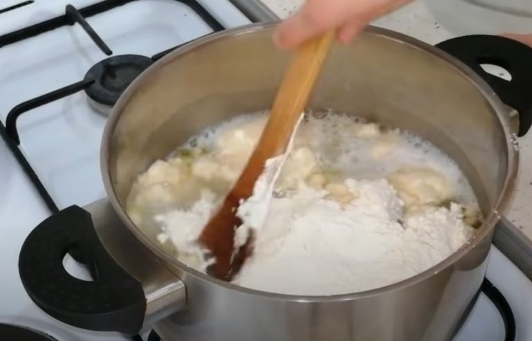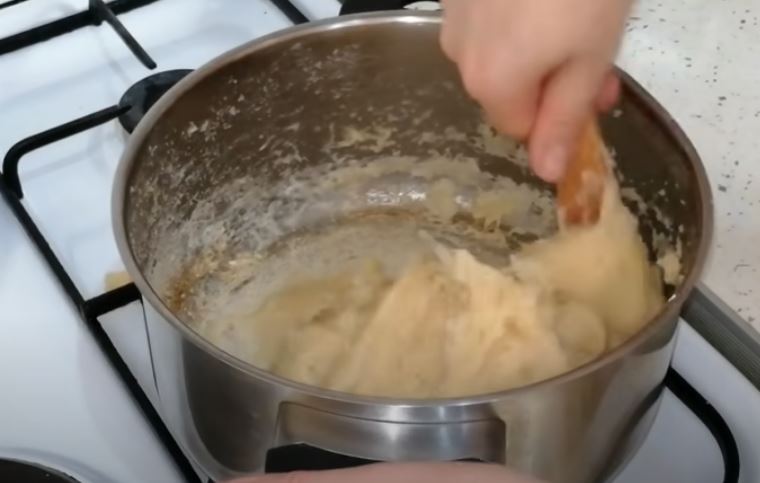 μέχρι να γίνει μια μπάλα που χωρίζεται από τα πλαινα της κατσαρόλας. Αφαιρέστε από τη φωτιά και μεταφέρετε τη ζύμη σε ένα μπολ.