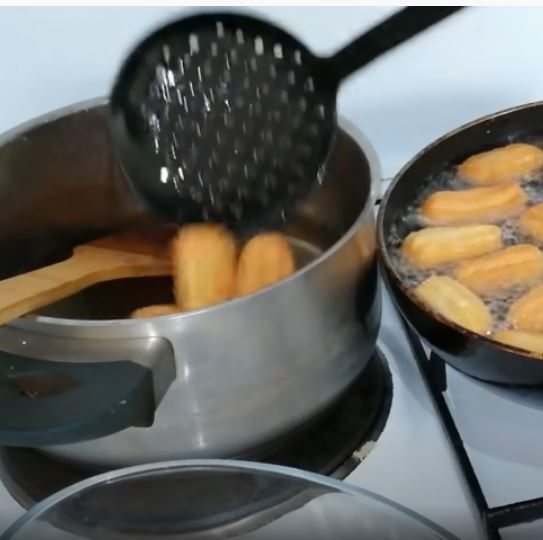 Ρίξτε 3-4 δάχτυλα λαδιού στο τηγάνι. Μεταφέρετε τη ζύμη ή μέρος αυτής (είναι ευκολότερο να δουλέψετε σε μικρά μέρη) σε μια υφασματινη σακούλα με άκρη σε σχήμα αστεριού. Εάν είναι δυνατόν, μην χρησιμοποιείτε πλαστική σακούλα, επειδή η ζύμη είναι βαριά και απαιτεί κάποια δύναμη. Πιεζουμε την ζύμη στο τηγάνι με κρύο λάδι.