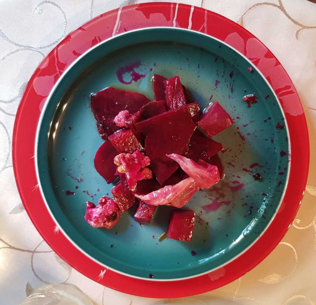 Δεν είναι προσπάθεια καλλιτεχνικής Φωτογραφιας ή Γκουρμέ – απλώς συνέβη και δεν έχω άλλη εικόνα!». Σας διαβεβαιώνω ότι είναι πολύ, πολύ νόστιμο! Οι καλεσμένοι μου ενθουσιάστηκαν! Γενικά δεν μου αρέσουν τα κόκκινα παντζάρια, αλλά σε αυτή την περίπτωση μου άρεσε πολύ! Δεν έχω μετρήσει τα λαχανικά, μπορείτε να τα αυξήσετε αυξάνοντας τις αναλογίες για την άλμη.