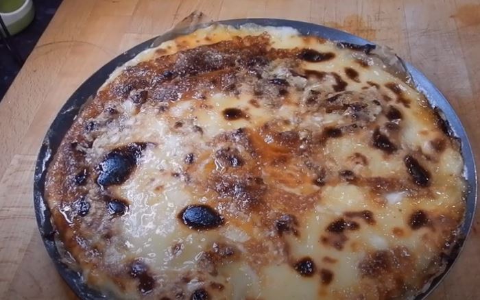 Μετα βάλτε το σε ένα δίσκο μεταλλικό πασπαλίστε με ζάχαρη και βάλτε στο γκριλ για 10 λεπτά να γίνει τραγανό. Αφήστε το να κρυώσει εντελώς και σερβίρετε.