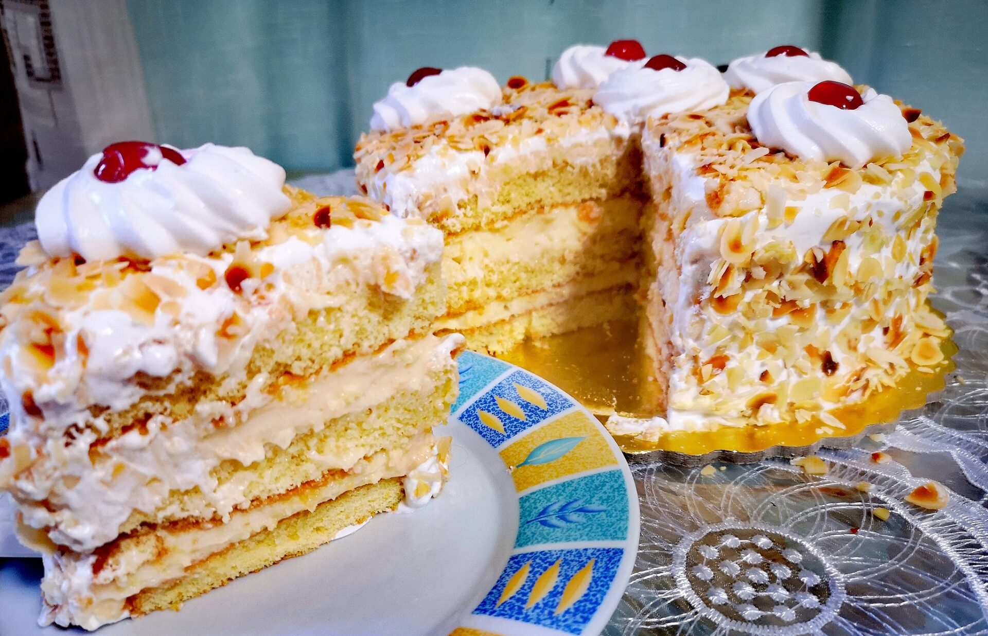 Alt Text 1: Η Τούρτα Αμυγδάλου, έτοιμη και διακοσμημένη με αμύγδαλα φιλέ και ροζέτες σαντιγί.