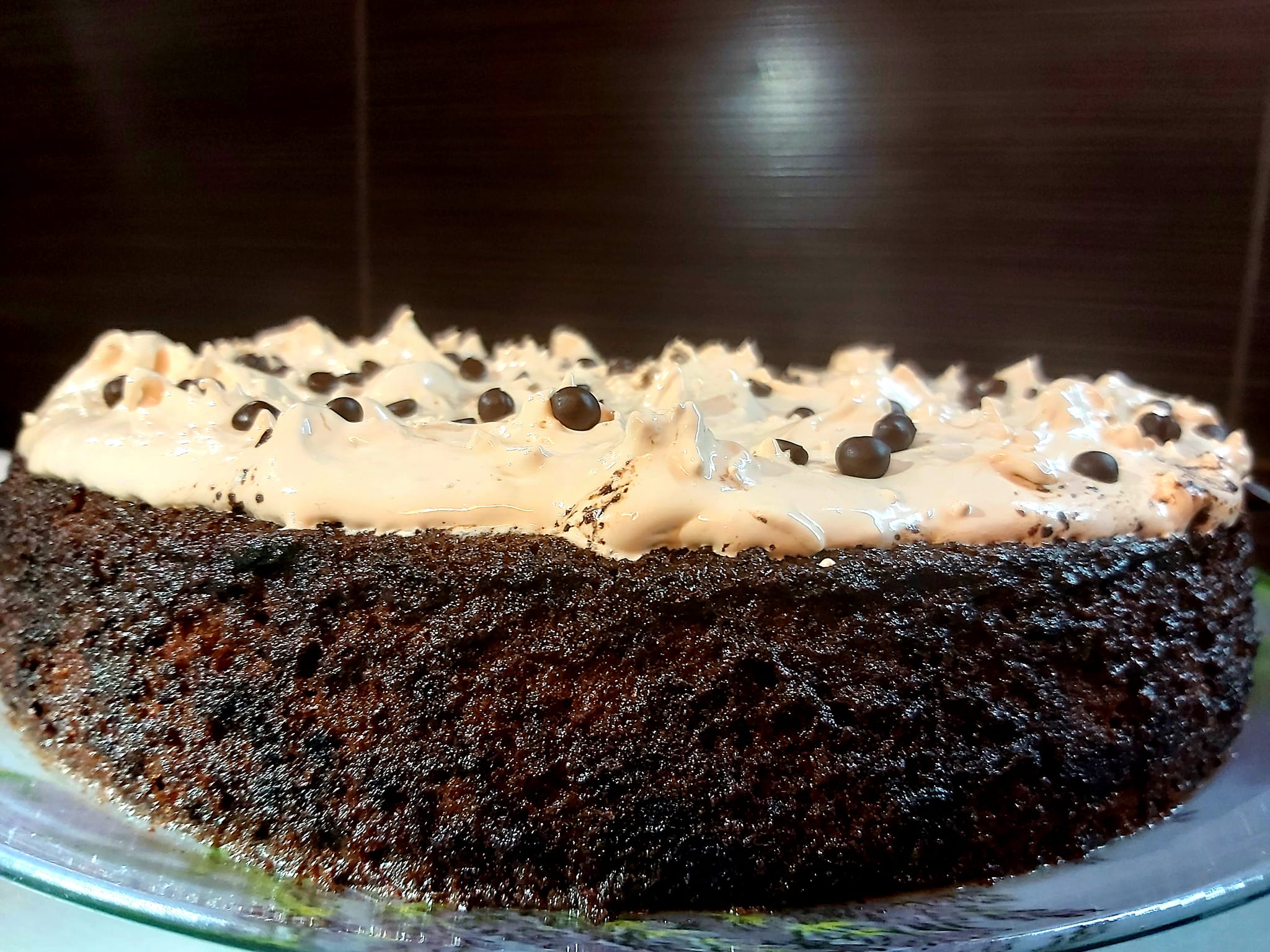 Για την επικάλυψη, χτυπάω τα ασπράδια αυγών. Καραμελώνω τις 8 κουταλιές της σούπας ζάχαρη και τις προσθέτω στα χτυπημένα ασπράδια. Απλώνω τη μαρέγκα από πάνω και πασπαλίζω με τριμμένη σοκολάτα.