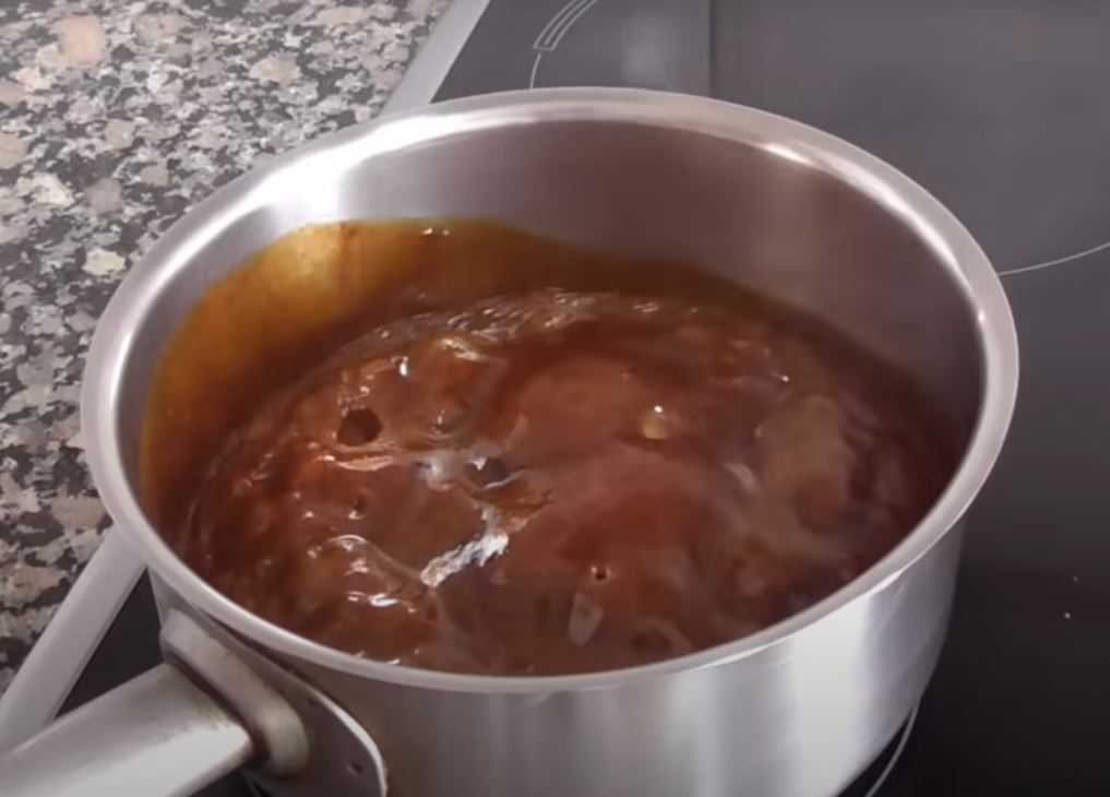 Διαλύουμε τα 10 γραμμάρια καφέ στο νερό και βάζουμε σε μια κατσαρόλα για να βράσουν μαζί με τη ζάχαρη. Αφήνουμε περίπου 3 λεπτά για να σχηματίσουμε ένα πηχτό σιρόπι, σχηματίζει αρκετές φυσαλίδες,οπότε είναι σημαντικό να αφαιρεθεί από τη φωτιά και να το αφήσουμε για λίγα λεπτά για να κρυώσει.