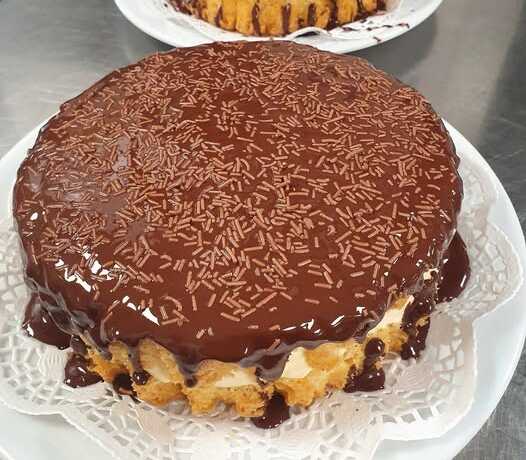 Μια ολόκληρη Τούρτα Κωκ, καλυμμένη με γυαλιστερό γλάσο σοκολάτας, σε λευκή πιατέλα