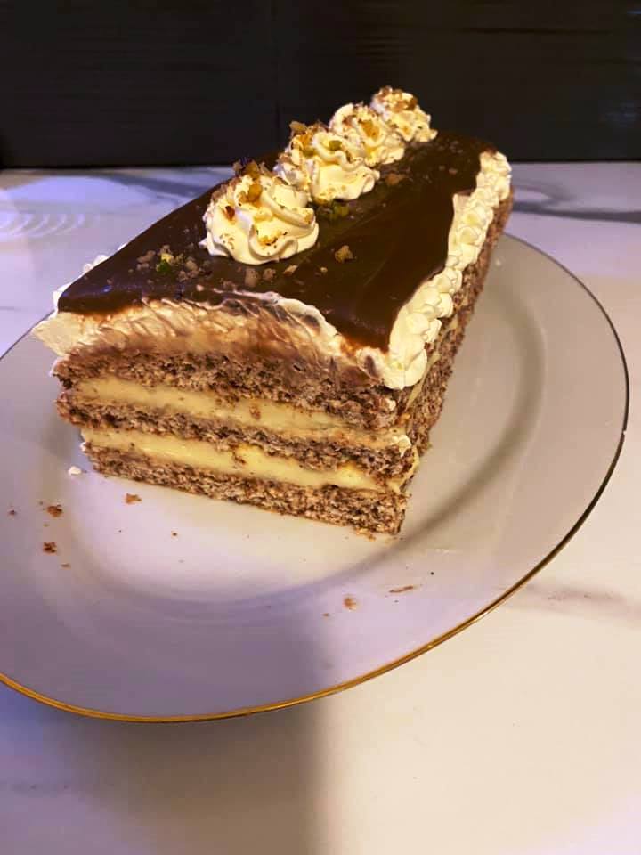Κόψτε την βάση σε 3 μήκη και ευθυγραμμίστε τα το ένα πάνω στο με κρέμα ενδιάμεσα. Κτύπησα επίσης κάποια έτοιμη σαντιγι για απο πάνω και την ολοκλήρωσα με επικάλυψη σοκολάτας και γαρνίρισα.