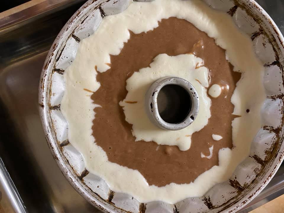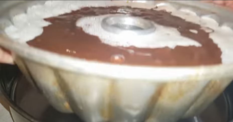 Προσθέτουμε το σοκολατένιο μειγμα μεσα στην φόρμα πάνω απο το υγρό μειγμα.
