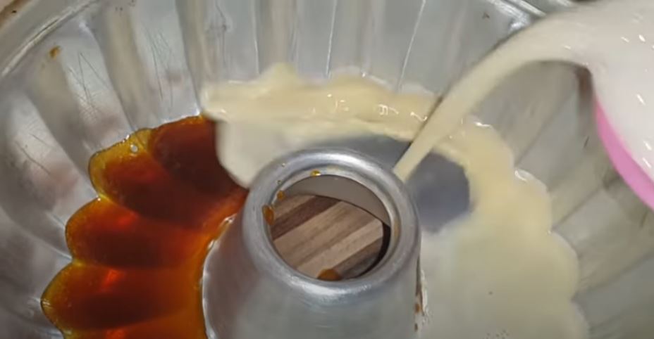 Στην φόρμα ρίχνουμε με την καραμέλα από πάνω ρίχνουμε το μειγμα γάλακτος.