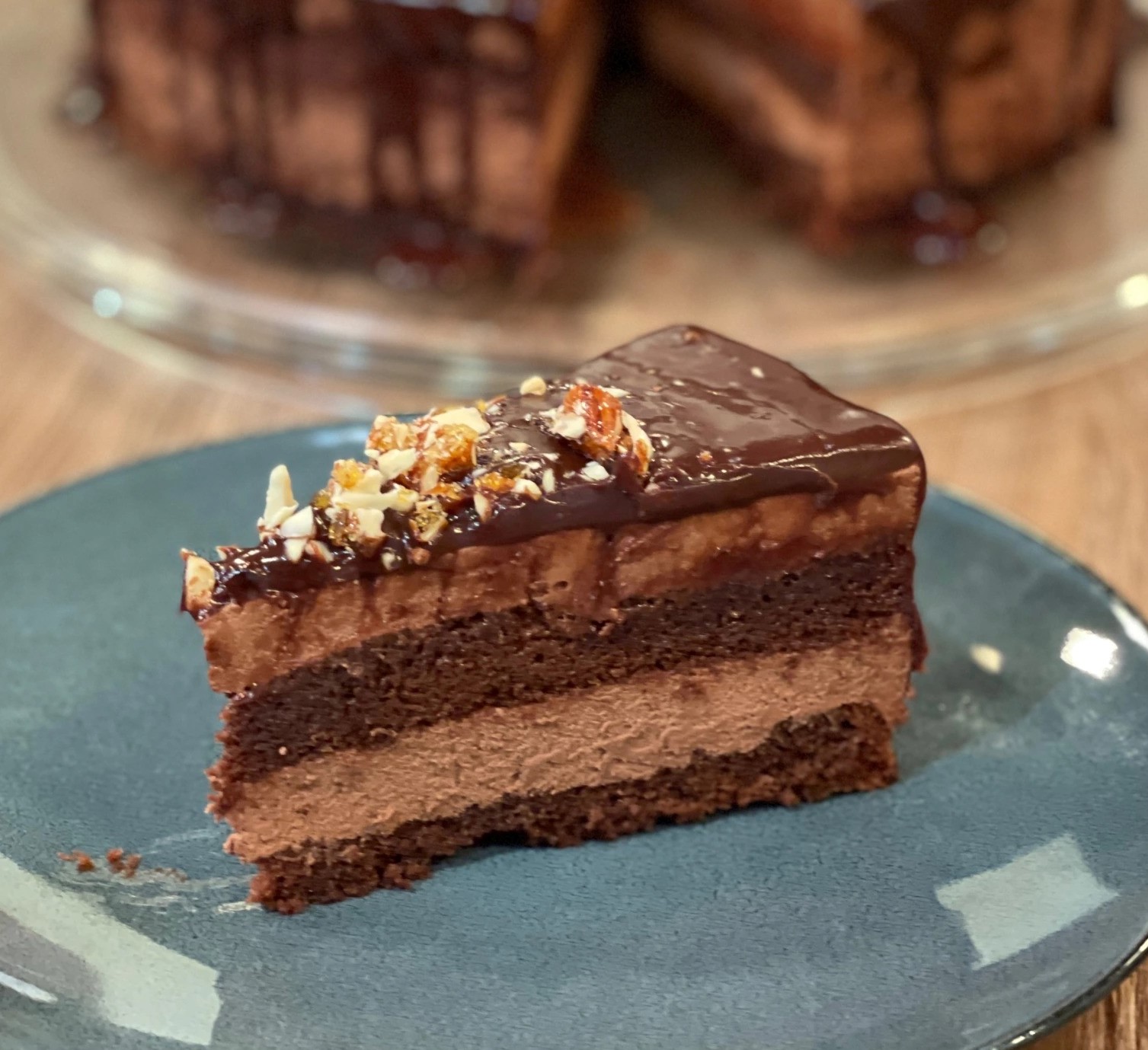 Περάστε ένα ζεστό μαχαίρι γύρω από το κέικ για να αφαιρέσετε το δαχτυλίδι του κέικ. Περιχύνουμε τη ganache πάνω από τη μους.
