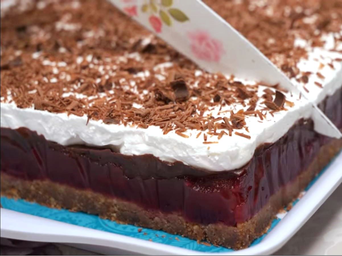 Απλώνουμε την σαντιγί πάνω από την σοκολάτα και την ισιώνουμε και πασπαλίζουμε με τριμμένη σοκολάτα