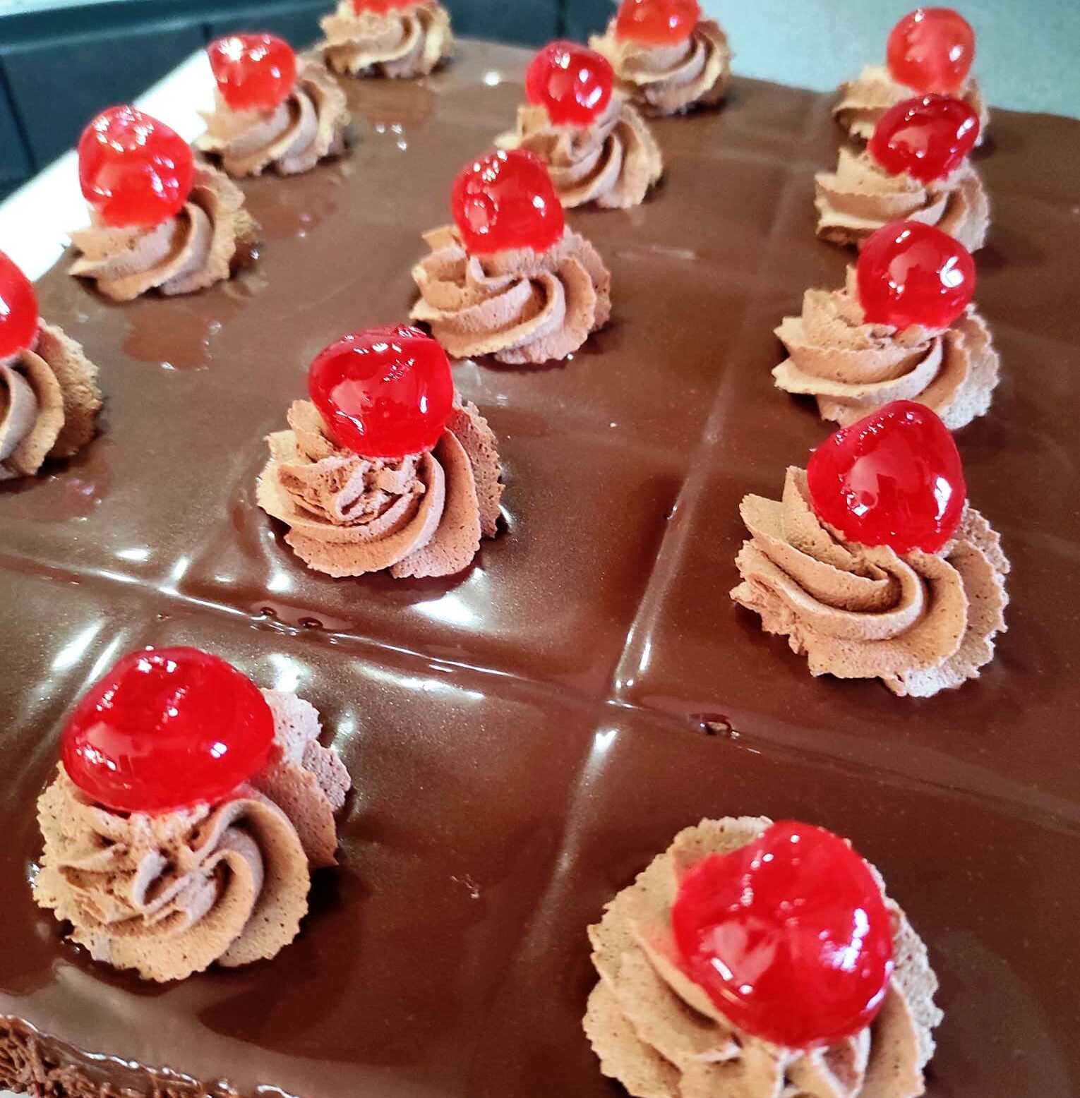 Στρώνουμε το παντεσπανι το βρέχουμε να υγρανθει με το σιρόπι μετα απλώνοπουμε την κρέμα και απο πάνω βάζουμε το άλλο παντεσπάνι και ακολουθουμε την ίδια διαδικασία. Στο τέλος απλώνουμε απο πάνω την γκαναζ και διασκσμούμε γυρω γύρω με τρουφα σοκολάτας και από πάνω ροζέτες σαντιγί και τέλος το κερασάκι στην τούρτα