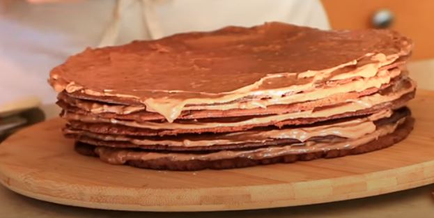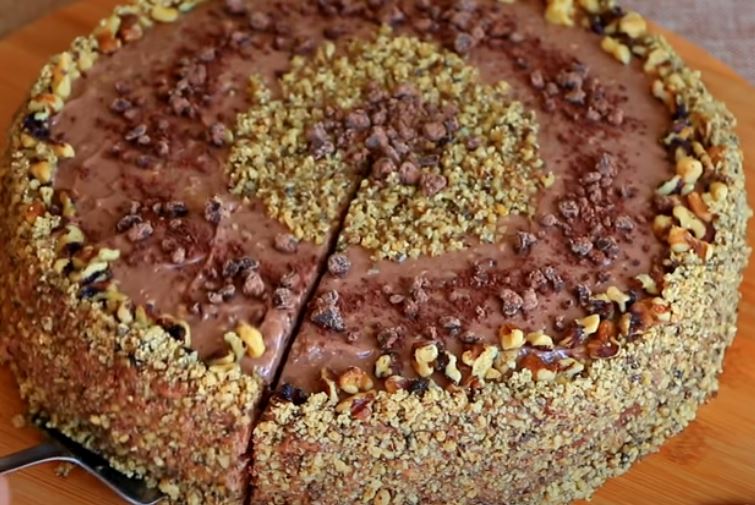 Αφού έχει κρυώσει η κρέμα προσθέστε χτυπημένο βούτυρο και χτυπήστε με μίξερ χειρός. Ανακατέψτε τα καρύδια και απλώστε την κρέμα με την σειρά(κρούστα-κρέμα). Καλύψτε την πέμπτη κρούστα με κρέμα και βάλτε το στο ψυγείο μέχρι την επόμενη μέρα.