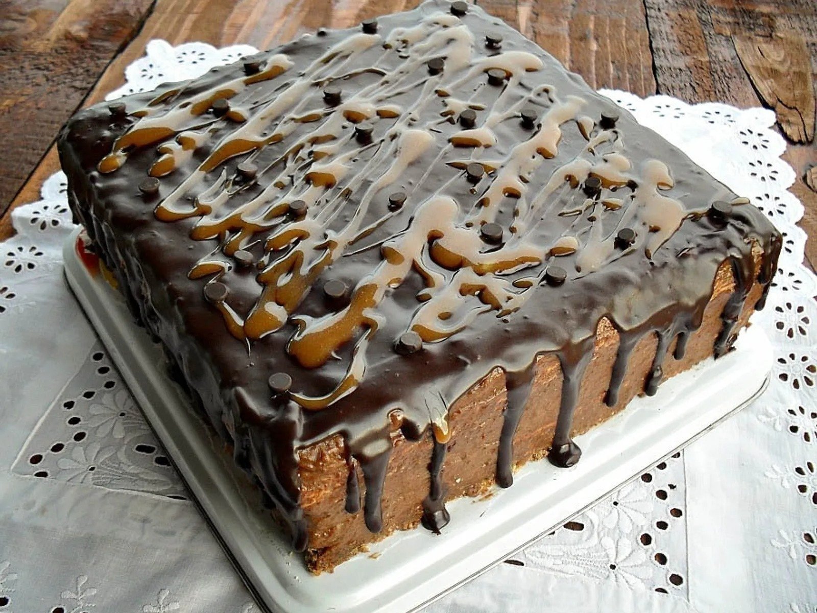 5. Διακοσμήστε κατά βούληση – εφτιαξα με σπιτική καραμέλα και πασπαλίζω και με σταγόνες σοκολάτας πάνω στο κέικ.