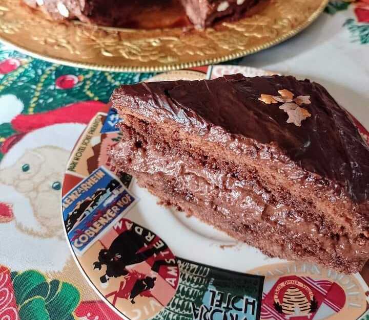 Ένα ολόκληρο κομμάτι Τούρτα σοκολατίνα, με πλούσια γκανάζ και διακόσμηση από τρούφα σοκολάτας, σερβιρισμένο σε πιάτο