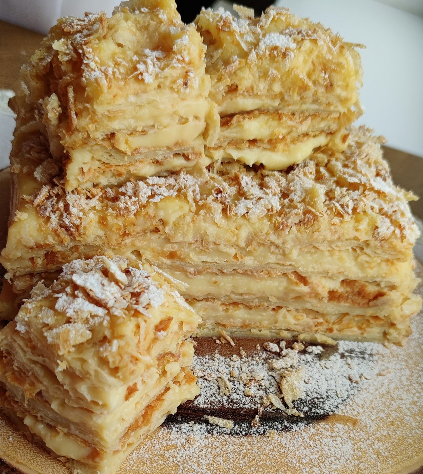 Συναρμολογούμε την τούρτα φύλλο – κρεμα εναλλαξ, και θα πάρουμε ένα κρεμώδες κέικ.
