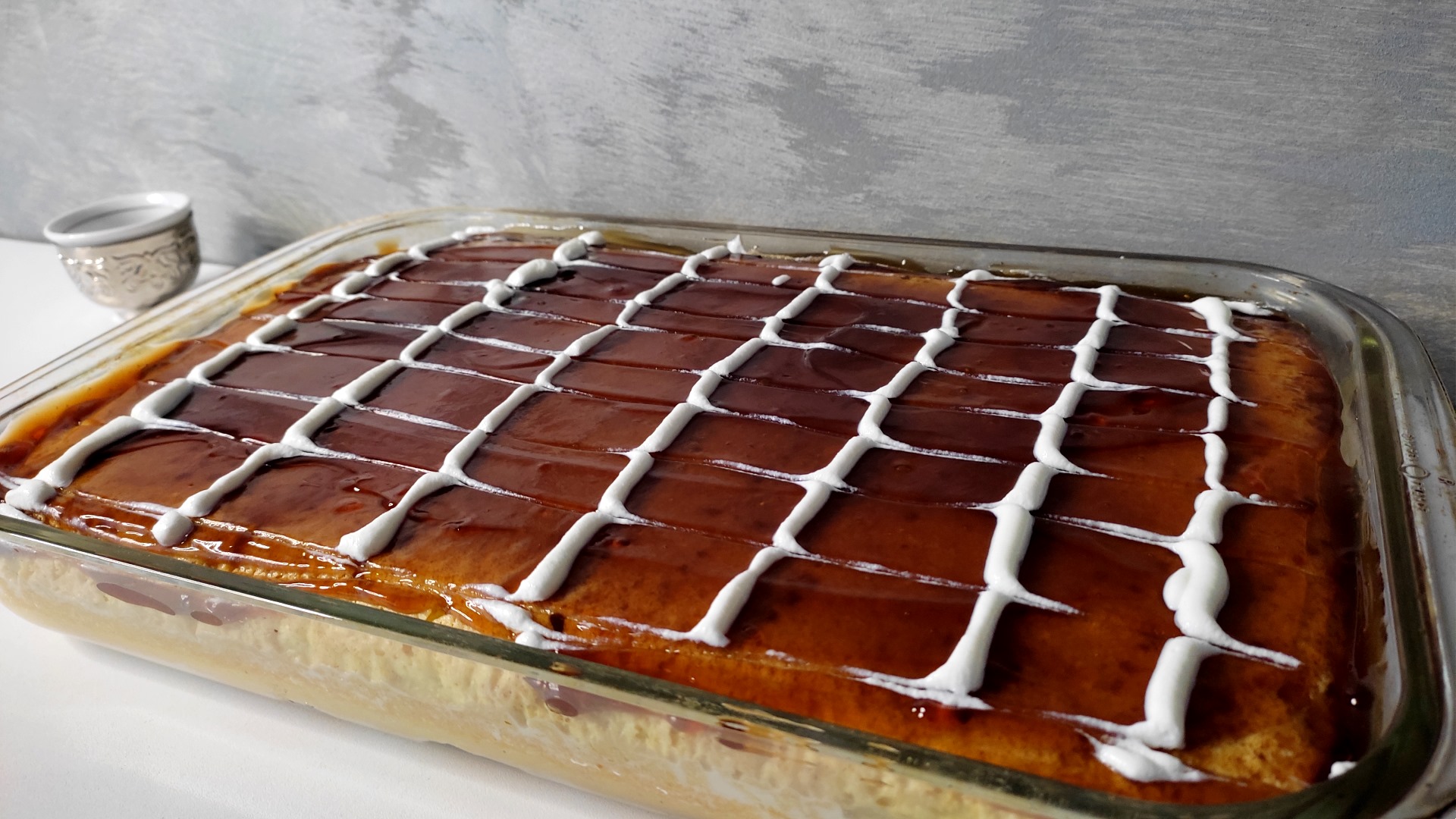 Αλειφουμε την επιφάνεια με καραμέλα ή μια μαρμελάδα ισιωνουμε διακοσμούμε κάνοντας γραμμες με σαντιγί και τραβάμε κάθετα με ένα καλαμάκι να κανουμε το σχεδιο. Βάζουμε στο ψυγείο για 2 ωρες.