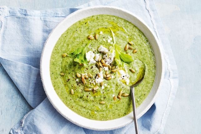 Βγάλε τη σούπα και άστην για να κρυώσει λίγο πριν την βάλετε στο μπλεντερ (σε δώσεις όχι όλη μαζι) μέχρι να γίνει βελουτέ. Αλατίστε. Ξαναβάλετην σε μια καθαρή κατσαρόλα σε μέτρια φωτιά μέχρι να ζεσταθεί. Σερβίρετε ρίχνοντας από πάνω τριμμένη φέτα, σπορους πασατέμπου, και τα ψιλλοκομένα φύλλα σέλινου και ραντιστε με επιπλέον λάδι.