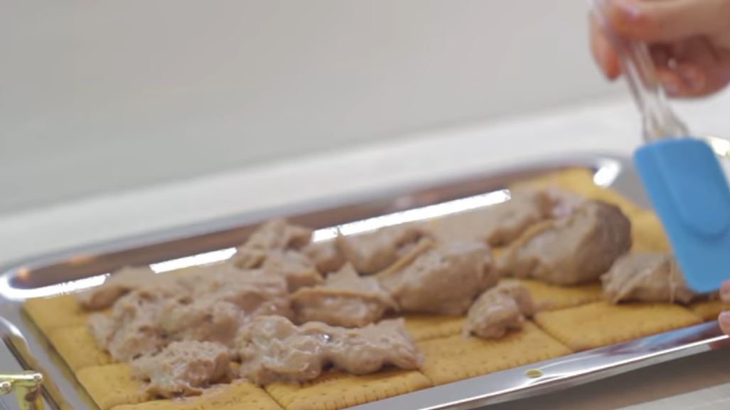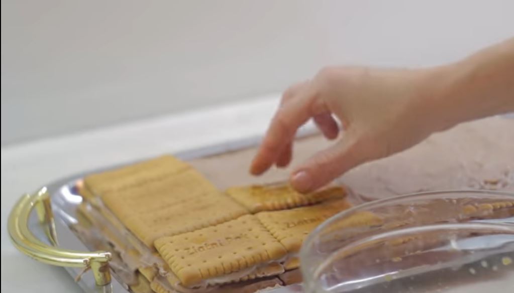 Απο πάνω απλώνουμε 1/3 της κρέμας, ξαναστρώνουμε δευτερη στρώση μπισκότα με το άλλο 1/3 και τρίτη στρώση μπισκότα με την εναπομείναν κρέμα και στρώνουμε τελευταία στρώση με μπισκότα.