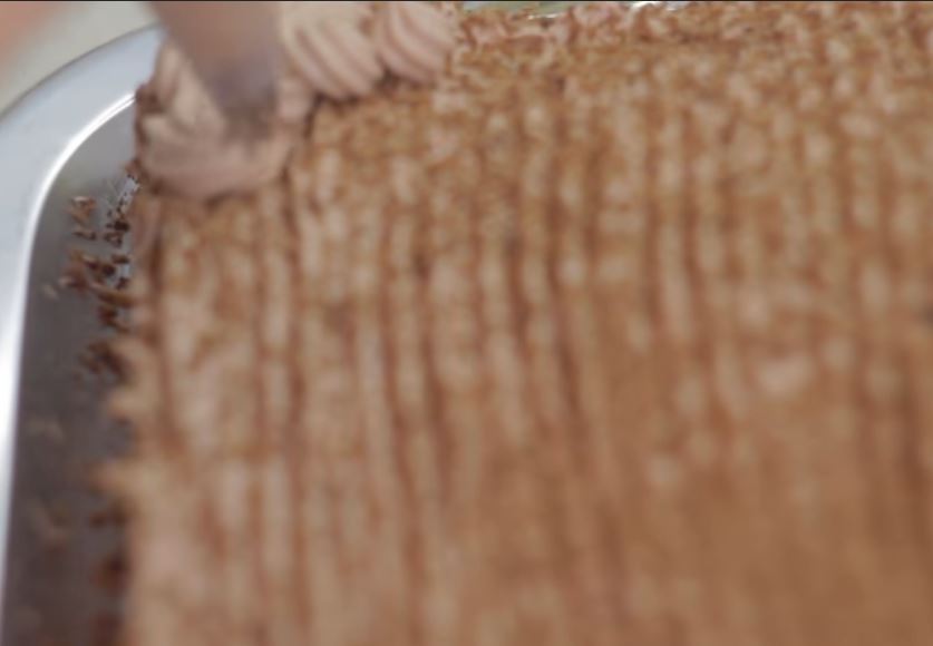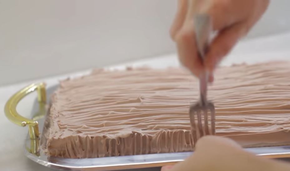 Κάνουμε σχέδια με το πηρουνι πασπαλίζουμε με τριμμένη σοκολάτα και φτιαχνουμε με ένα κορνε ζαχαροπλαστικής ροζέτες γυρω γυρω.