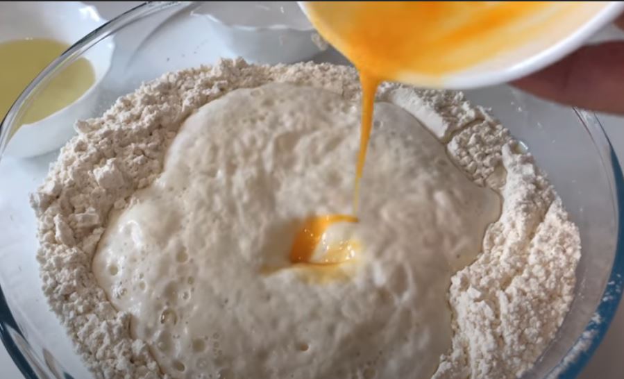 Σε ένα άλλο μπολ κοσκινίζουμε το αλεύρι,αλάτι κάνουμε λίγο χώρο μέσα στο αλεύρι και ρίχνουμε το μείγμα της μαγιάς, αυγό , 50 γρ ηλιέλαιο και ανακατεύουμε να πάρουμε μία κολλώδη ζύμη και ζυμώνουμε για 10 λεπτά.