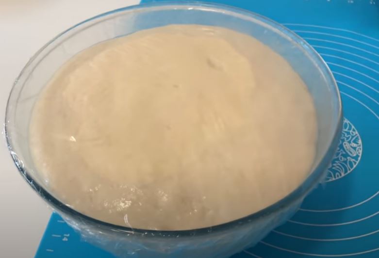 Λαδώνουμε ένα μπολ βάζουμε την ζύμη και την σκεπάζουμε με μία μεμβράνη και την αφήνουμε σε ένα ζεστό μέρος να φουσκώσει για 40 λεπτά.