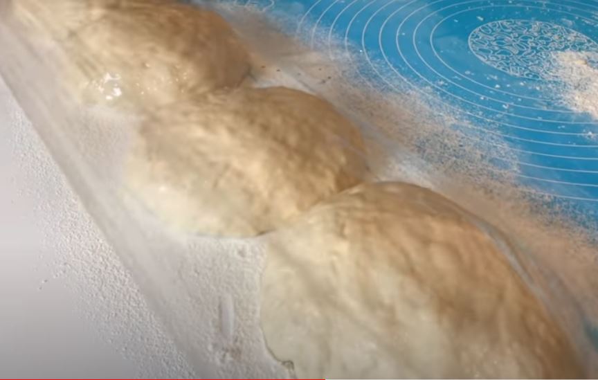 Αλευρώνουμε καλά το πάγκο μας και αδειάζουμε την ζύμη. Την δουλεύουμε πάλι με τα χέρια μας και την χωρίζουμε σε 4 ίσα μέρη τα λαδώνουμε και τα σκεπάζουμε με μια μεμβράνη.