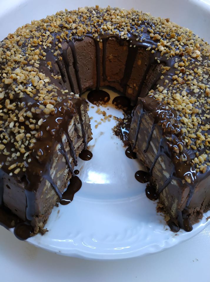 Βάζουμε μεμβράνη σε μια φόρμα του κέικ και στρώνουμε το μείγμα το παγώνουμε και το σερβίρουμε από την κατάψυξη για ντεκόρ έβαλα κουβερτουρα και τριμμένο φουντούκι .