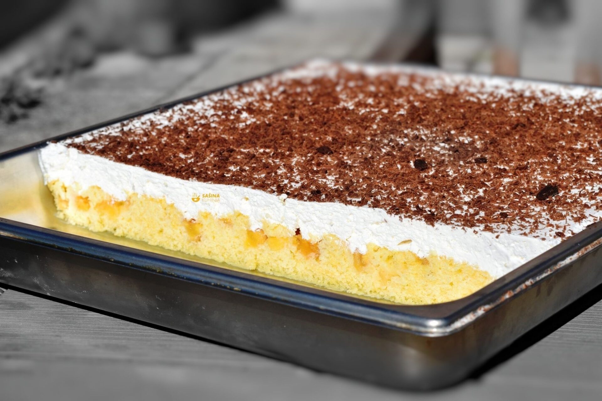 Απλώνουμε την σαντιγί από πάνω και τρίβουμε την σοκολότα