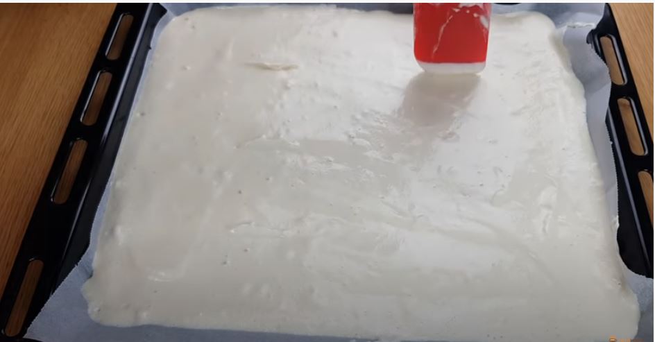 Στρώνουμε ένα ταψί της κουζίνας μας με χαρτί ψησίματος και αδειάζουμε μέσα το μείγμα και το απλώνουμε το πάχος του μείγματος να είναι ιδιο παντού στο ταψί.
