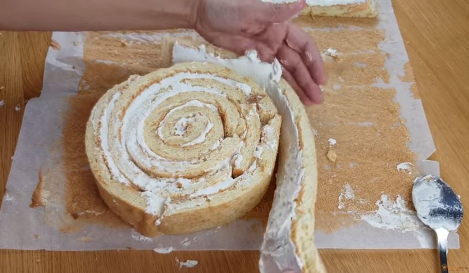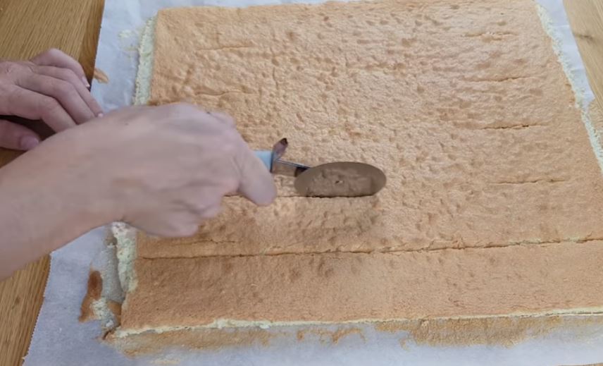 Βγάζουμε το κεικ από το φούρνο κόβουμε γυρω γυρω τις άκρες το μήκος να ειναι περίπου 30 εκχύλισμα και το κόβουμε σε λωρίδες μήκους 5 εκ.