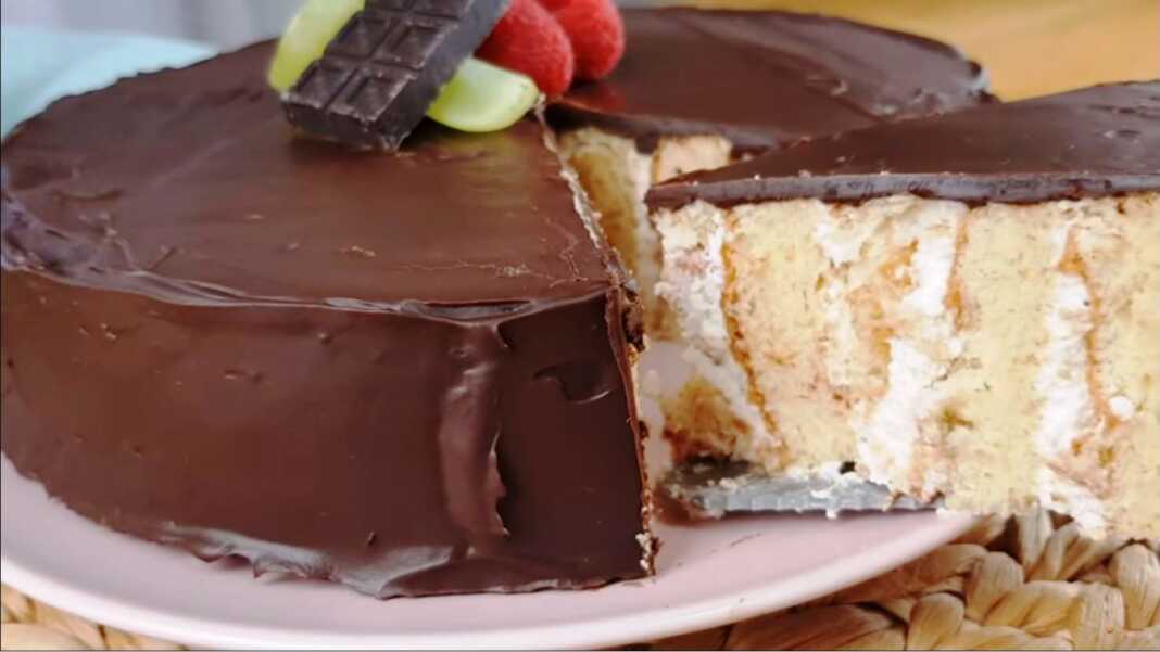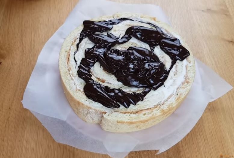 Γυρίζουμε το την τουρτα σε ένα πιάτο για να αφαιρέσουμε το χαρτί και απλώνουμε απο πάνω και γυρω γυρω σοκολάτα.