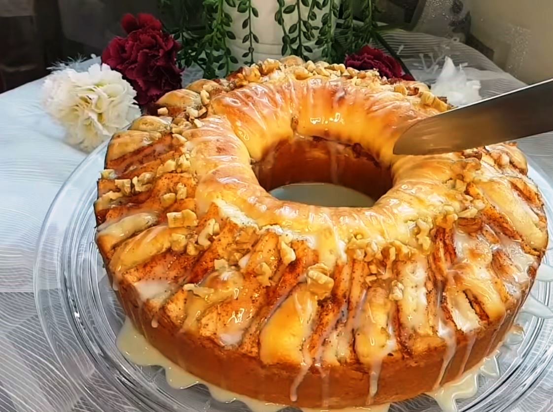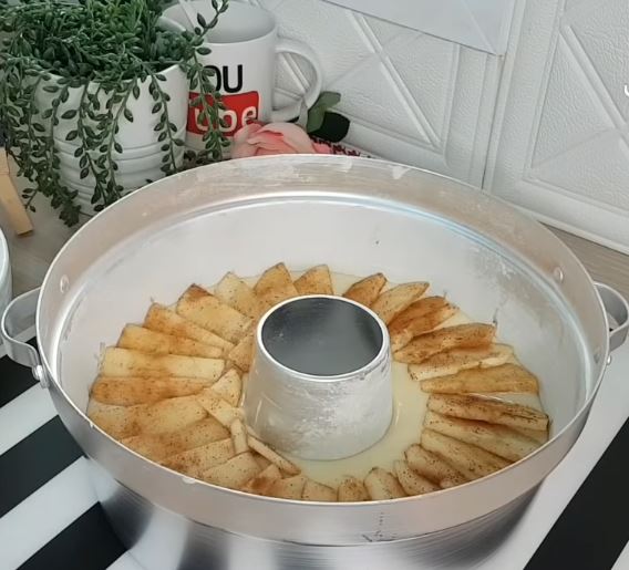 Τοποθετούμε τα μήλα μέσα στο μείγμα του κέικ το ένα διπλό στο άλλο επικαλύπτοντάς λίγο