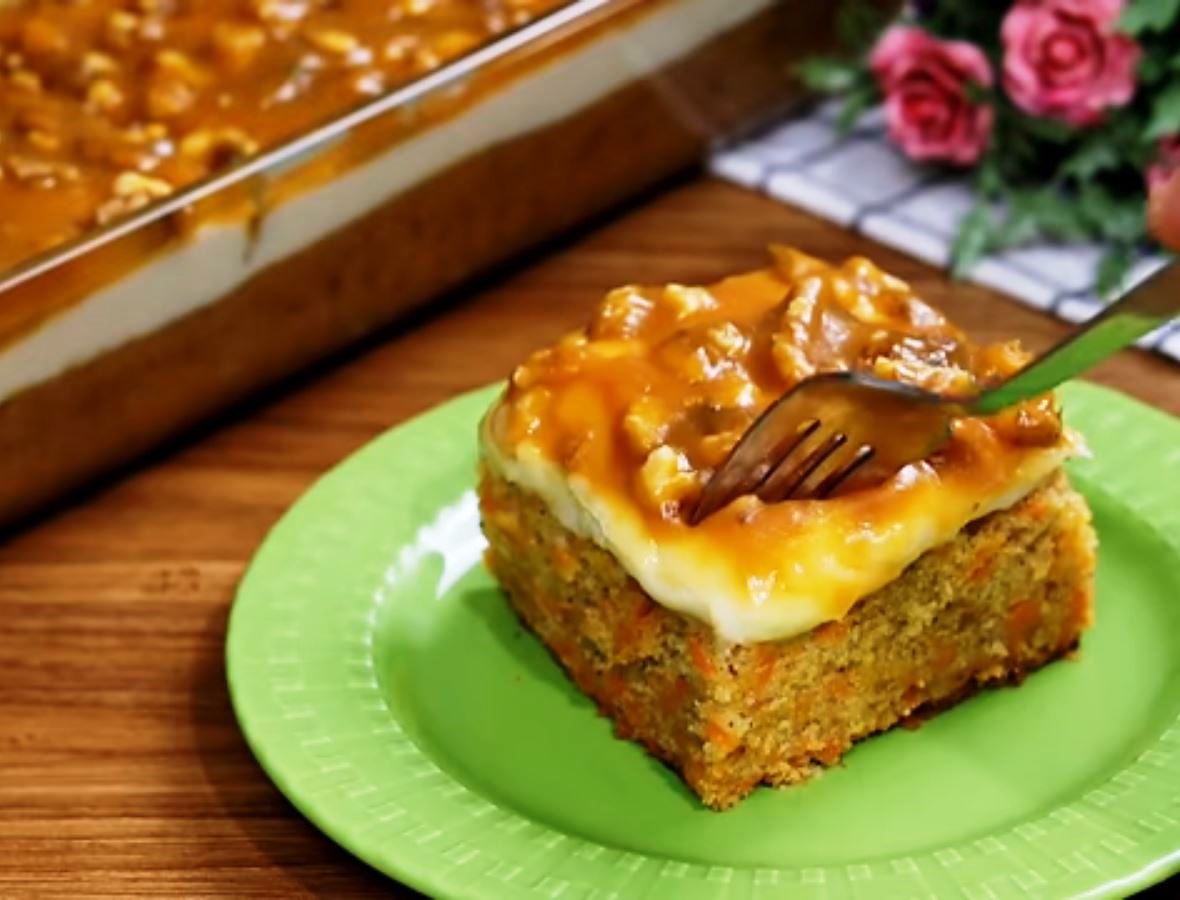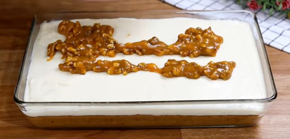 Την απλώνουμε την καραμέλα αφήνουμε το γλυκό για λίγο στο ψυγείο μετα το κοβουμε και σερβίρουμε