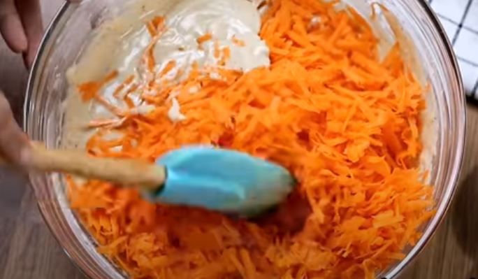 Τρίβουμε τα καρότα στο χοντρό και τα αδειάζουμε μέσα στο μείγμα μας