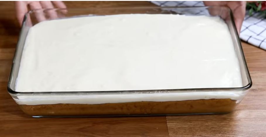 Αδειάζουμε πάνω από το κείκ την κρέμα αφου πρωτα την αφρατεψουμε λίγο με το μιξερ