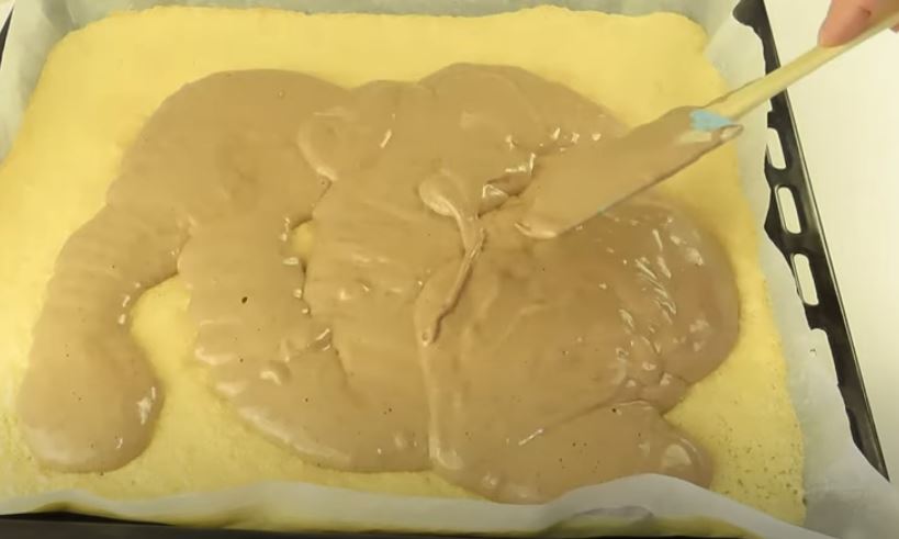 Ενώ το κίτρινο μείγμα είναι μισόψημένο το βγάζουμε από το φούρνο και απλώνουμε από πάνω το καφέ μείγμα και συνεχίζουμε να ψήνουμε για 8-10 λεπτά ακόμη.