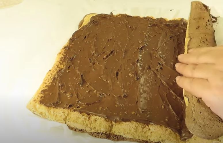 Τυλίγουμε το ρολό με το νέο χαρτί ψησίματος μία φορά μετά το ανοίγουμε και απλώνουμε 5-6 κουταλιές νουτέλα και ξανατυλίγουμε με την βοήθεια του χαρτιού ψησίματος και πλέον παίρνουμε ένα ρολό.