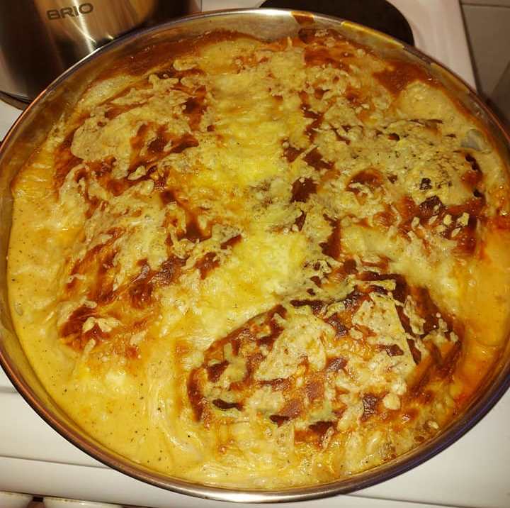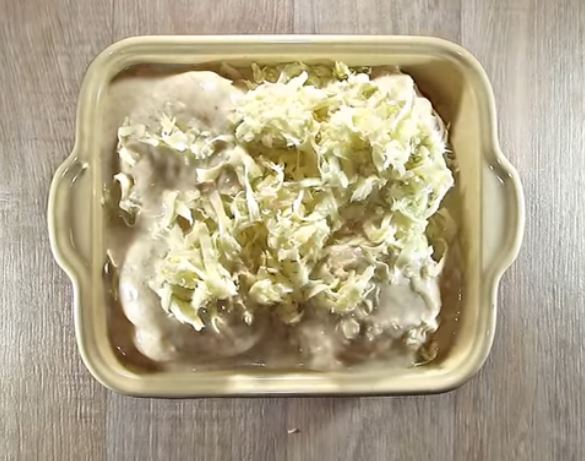 Αυτό επαναλαμβάνεται 3 ακόμη φορές. Ρίχνουμε τη σάλτσα πάνω από τις μπάλες και πασπαλίζουμε γενναιόδωρα με τριμμένο κίτρινο τυρί.