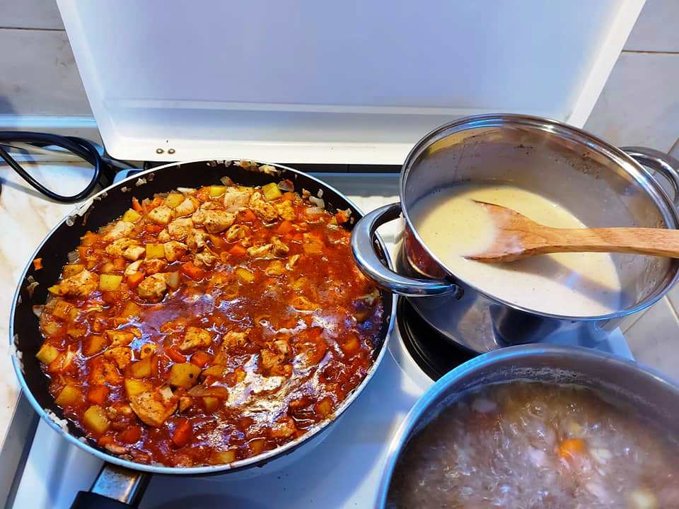 Προσθέστε το ψιλοκομμένο κοτόπουλο με λίγο νερό ώστε να μην κολλήσει και μαγειρέψτε για λίγο Προσθέτουμε τον πουρέ ντομάτας τη ζάχαρη, το αλάτι, το πιπέρι και το κύμινο, ανακατεύουμε μαγειρεύουμε για 4-5 λεπτά και αφαιρούμε τη γέμιση από τη φωτιά