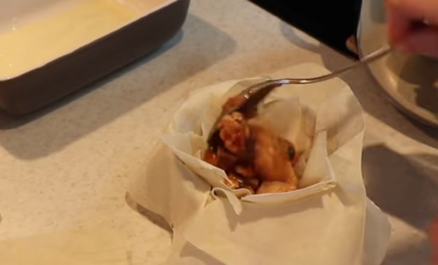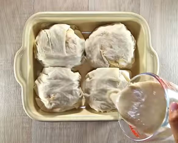 Τοποθετήστε 2 φύλλα σε ένα μπολ να κρέμονται στις πλευρές ελεύθερα. Γεμίστε με μερική από τα γέμιση και τα άκρα ενώνονται στην κορυφή να γίνει μία μπάλα.