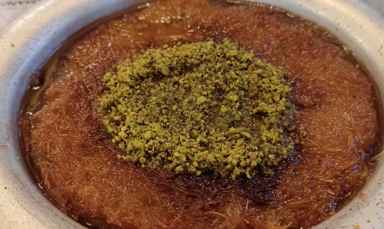 Μετά από 50 λεπτά, το βγάζουμε από το φούρνο και ρίχνουμε το σιρόπι στο ζεστό κιουνεφε.