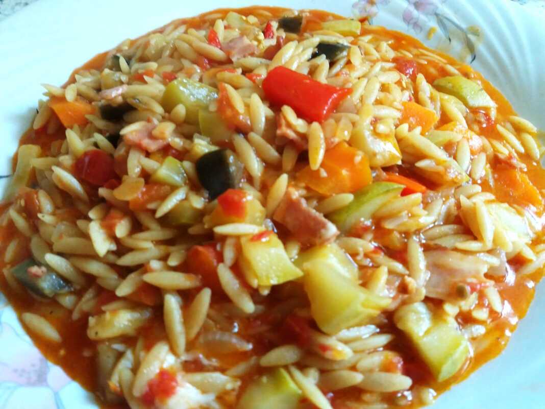Μου περίσσεψαν 1 κολοκυθάκι και 1 μελιτζάνα και αναρωτιόμουν τι να τα κάνω, ώσπου μου είπαν να μην φτιάξω "σκέτο" κριθαράκι. Και έτσι, έβαλα τα δυνατά μου για να γλιτώσω τη γκρίνια του και έφτιαξα ένα απίθανο κριθαράκι με λαχανικά και μπέικον! Το αποτέλεσμα ήταν ένα φαγάκι που σε γλυκαίνει από ευχαρίστηση και όλοι έμειναν απόλυτα ικανοποιημένοι.