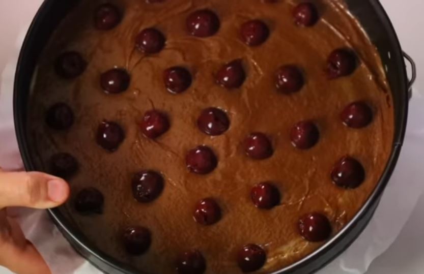 Τα βύσσινα τοποθετούνται στη ζύμη σε σειρές.