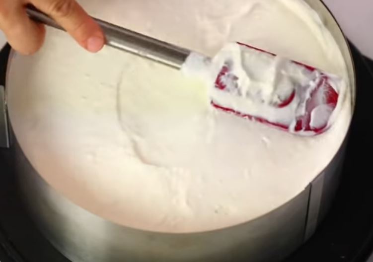 Προσθέτουμε την κρεμα πάνω από το κρύο κεικ βασης και κραταμε μια μικρή ποσότητα κρέμας που προορίζεται για διακόσμηση στο κέικ.