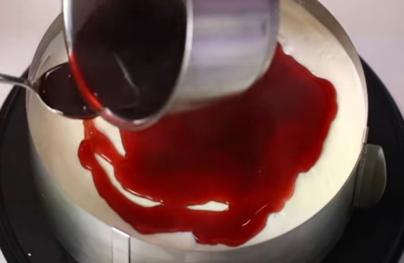 Αφού βγει κρυώσει λίγο το υγρό ζελε, απλώνεται πάνω στο κρύο κέικ.