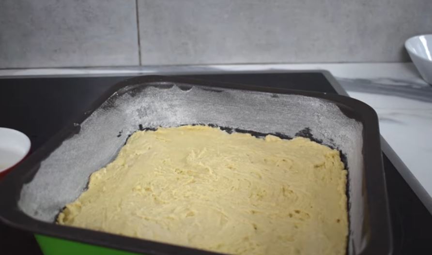 Βυθίστε ένα κουτάλι σε νερό και στρώστε τη ζύμη στο έτοιμο ταψί με το πίσω μέρος ενός υγρού κουταλιού.