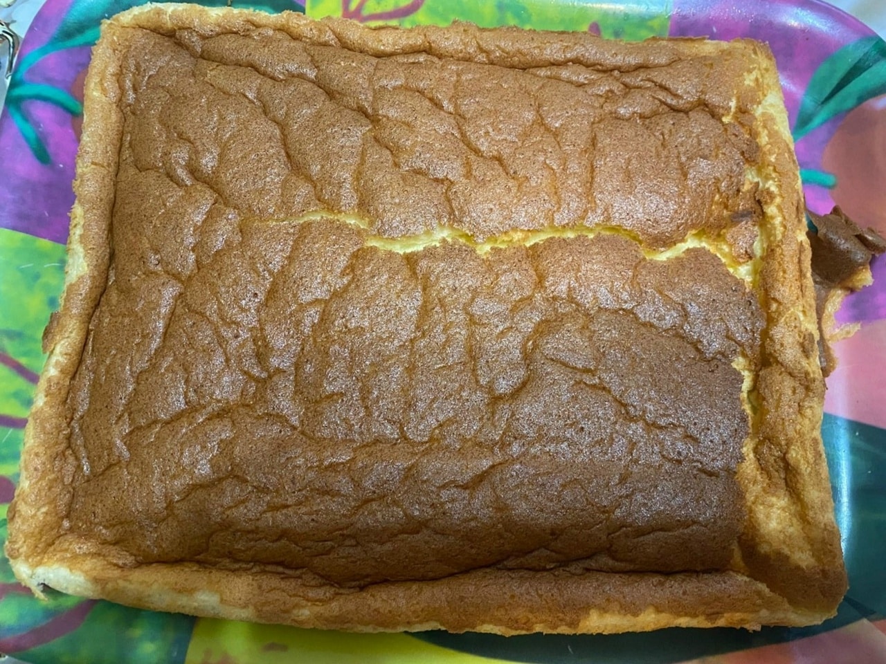 Κομμάτια από μαγικό κέικ 3 στρώσεων με ορατές τις τρεις υφές